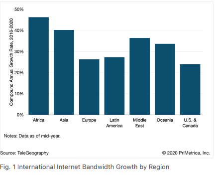 It is no doubt that internet access has become essential to research and technological and commercial development. Africa’s international bandwidth has been increasing, from 4.5 TBps in 2012 to 10.9 in 2018 and 15.3 in 2019. At the same time, Africa’s operational fiber optic network has also been expanded to over 1 million route km.