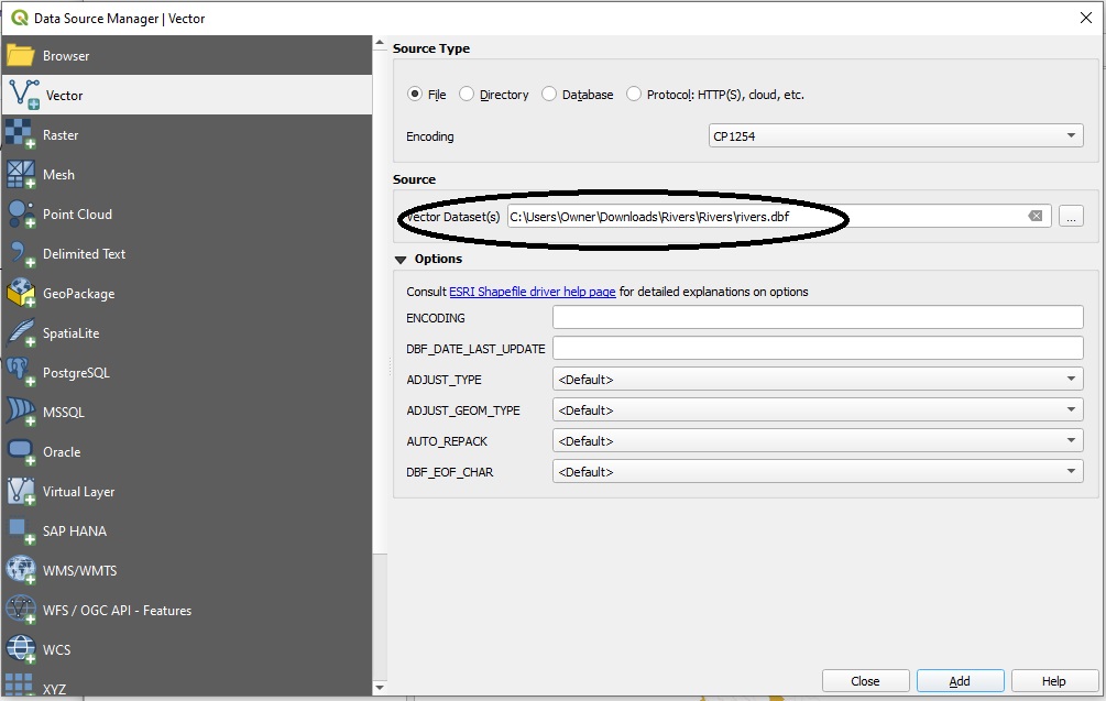 Step 5. Go to QGIS and open all the layers from the archives one by one. You are interested in importing all files with the extension “.dbf”, this is a file that saves spatial attributes of the data in a tabular format. Here is how the interface looks after you go to Layer -> Add Layer -> Add Vector Layer and then you will import the respective .dbf file from the Rivers.zip archive.: